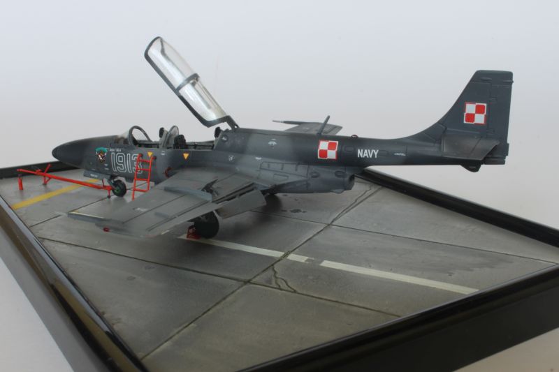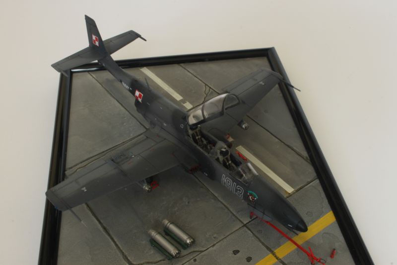 W celu należytego wyeksponowania modelu wykonałem podstawkę imitującą fragment płyty postojowej. Umieściłem na niej klocki pod koła podwozia głównego, które były na blaszkach wchodzących w skład zestawu, a także wykonane od podstaw wodzidło, drabinkę i gaśnicę. Dwa pozostałe zasobniki z nkpr ustawiłem na podstawach których kształt podpatrzyłem w Internecie.