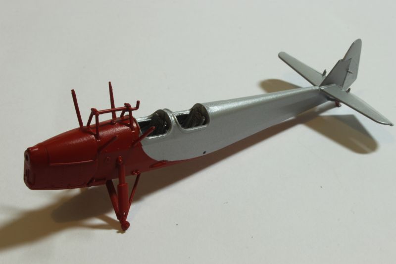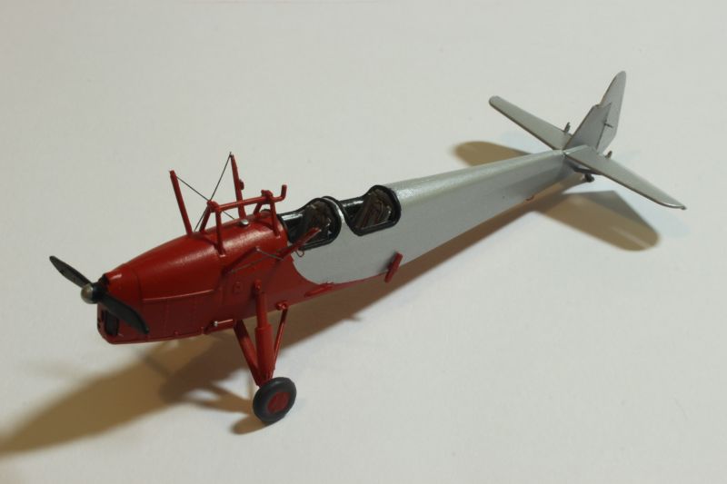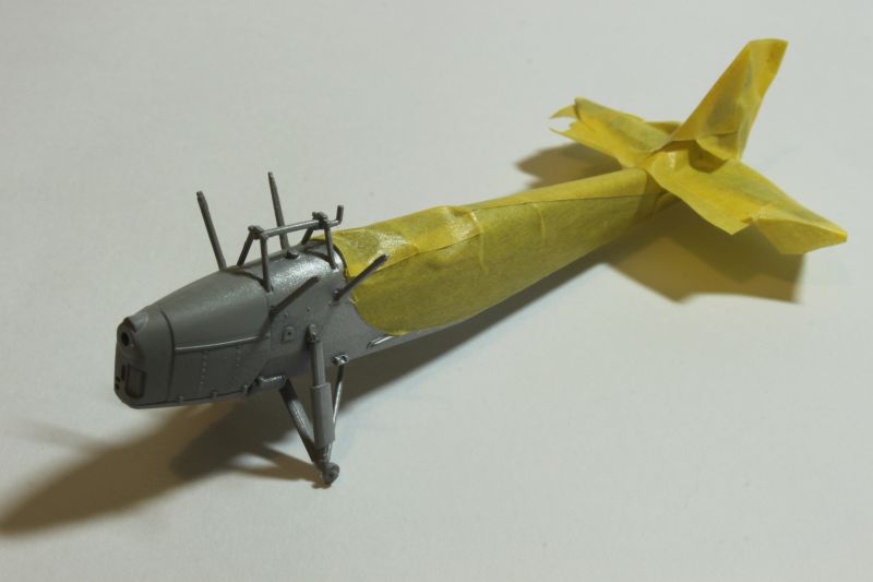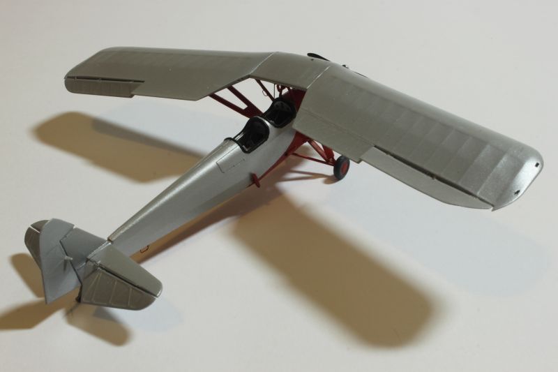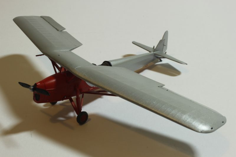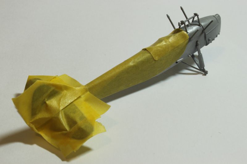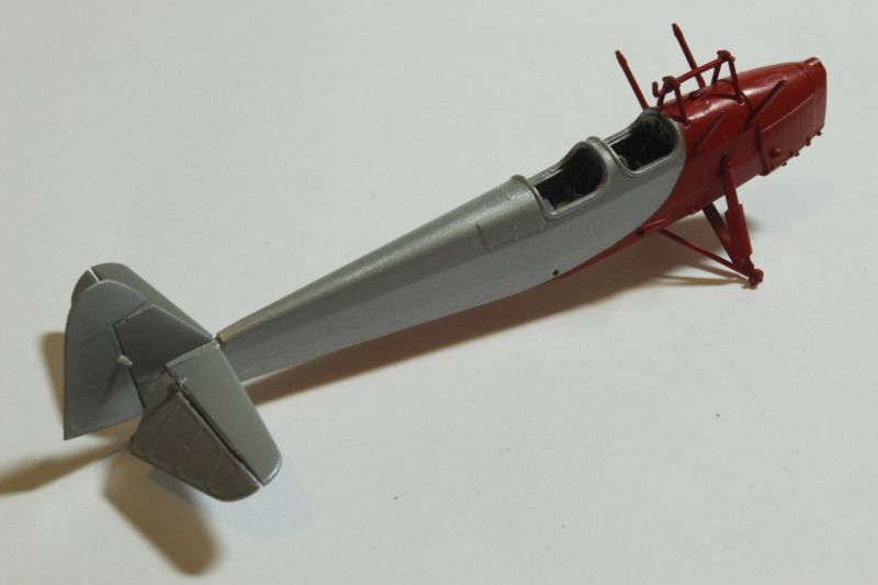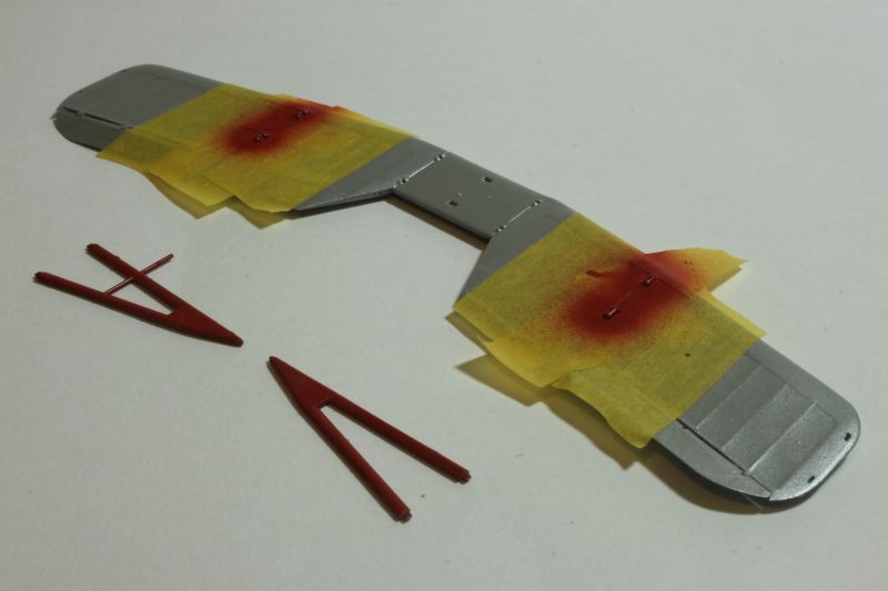 Do malowania obu modeli użyłem krajowych lakierów firmy Bilmodelmaker z Gdyni. Stosuję je od pewnego czasu i jestem bardzo zadowolony z efektów, jakie uzyskuję. Wymagają one co prawda bardzo starannie przygotowanej powierzchni, ale teoretycznie można malować bez stosowania podkładu. Celowo napisałem, że teoretycznie, gdyż podkład stosuję zawsze, bez względu na farby jakimi maluję dany model. Tak było i tym razem, prysnąłem rozłożony na czynniki pierwsze model sprayem Tamiyi, a po jego wyschnięciu zabrałem się za właściwe malowanie. Farby te nie nadają się do malowania pędzlem, na co należy zwrócić uwagę, poza tym używanie ich w mieszkaniu podobnie jak w przypadku Alcladów niesie ryzyko zasmrodzenia go i wojny domowej. Na początek kadłub i płat DWL-a pokryłem metalizerem „White Alluminium” co dobrze imituje pomalowane na srebrno pokrycie płócienne. Osłona silnika PWS-a została natomiast pomalowana kolorem „Polisched Alluminium” Po 10 minutach pomalowana powierzchnia była sucha i odporna na dotykanie, drapanie itp. Modele można było bez obaw brać do ręki i przygotować do nakładania kolejnego koloru, jakim był „Signal Red” (DWL) oraz „Polisch Khaki 102” (PWS). Maskowanie przy użyciu taśmy Tamiyi zajęło mi więcej czasu niż malowanie. Zaś cały proces trwał około dwóch godzin, włącznie z schnięciem farby.