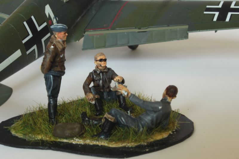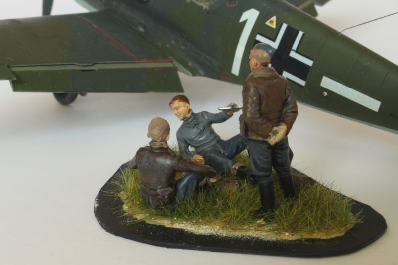 Model Emila z początkowych dni wojny postanowiłem zatem wykonać. Ponieważ dysponowałem podobnym zestawem dodatków nie będę po raz kolejny pokazywał poszczególnych etapów jego budowy, bo były one niemal identyczne jak w przypadku samolotu w barwach RAF-u opisywanego niedawno. Poza malowaniem wrześniowy Emil różni się sposobem jego wyeksponowania. Wszystkie samoloty na wystawie MDLot eksponowane są na lustrach, żeby można było zobaczyć również je od dołu. Dlatego zaniechałem wykonywanie podstawki z fragmentem lotniska. Zamiast tego wykonałem niewielką winietkę z figurkami niemieckich pilotów. wykorzystałem do tego zestaw SW-10 „German pilots playing Hess” firmy Andrea Miniatures, którym dodałem do towarzystwa pilota zestawu ukraińskiego ICM-u. partyjki szachów. Figurki zostały sklejone, pokryte podkładem a potem nieudolnie zacząłem kopiować patenty stosowane przez modelarzy figurkowych. Malowałem, podmalowywałem, starałem się cieniować, łoszować, przecierać. Mistrzostwo świata to to nie jest, ale jako dodatek do modelu sprawuje się nieźle.