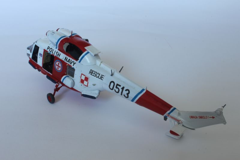 Czas na nałożenie kalkomanii. Z produktami Bilmodela dołączanymi do modeli TopGuna miałem wcześniej do czynienia niejednokrotnie i nie miałem problemów z ich nakładaniem na model. Tak było i tym razem, choć na sporych rozmiarów napisy należało uważać. Nie zmienia to faktu, że kalkomanie dobrze reagują na chemię i co najważniejsze się nie srebrzą. Producent przewidział możliwość wykonania jednej z trzech maszyn używanych w naszej Marynarce Wojennej. Wybrałem maszynę o numerze 0513 z 28 Puckiej Eskadry Lotniczej z Gdyni Babich Dołów. Maszyna ta ma dość ciekawą historię. Została zakupiona przez firmę Petro Baltic dla obsługi platform wiertniczych. Ponieważ firma nie posiadała własnych odpowiednio przeszkolonych pilotów, zdecydowano się na dostarczenie śmigłowca Marynarce Wojennej, która w zamian miała obsługiwać platformy wiertnicze Petro Balticu w rejonie Morza Bałtyckiego, mając jednocześnie możliwość wykorzystywania śmigłowca do własnych celów. Z czasem, z uwagi na uwarunkowania prawne, śmigłowiec przekazano Marynarce w drodze darowizny. Pełni on służbę do dnia dzisiejszego, z tym, że nie nosi już loga Petro Balticu, ale własna nazwę "Pszczółka". Mój model z kolei nosi malowanie w wczesnego okresu służby.