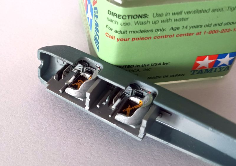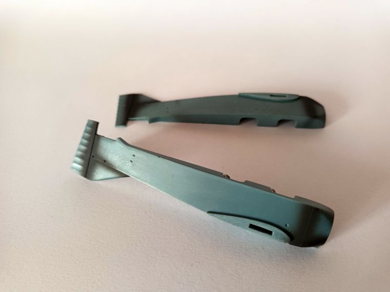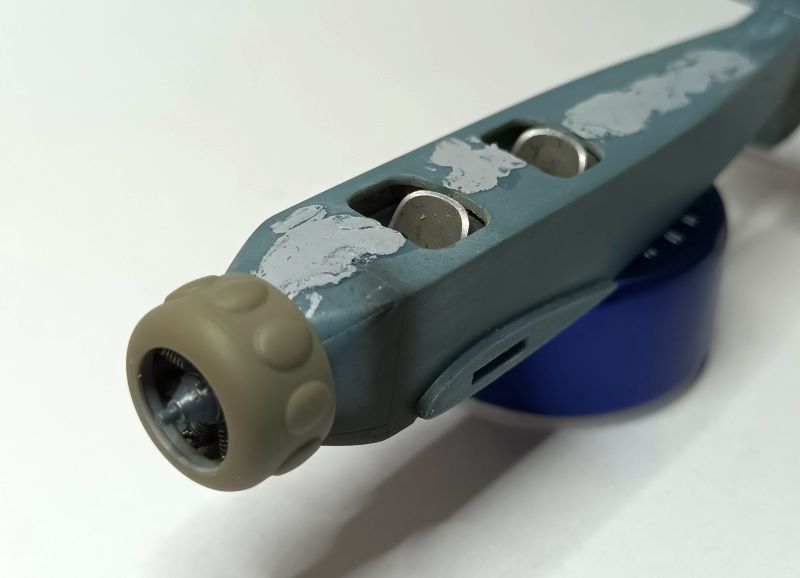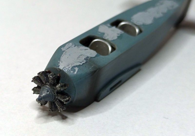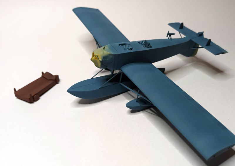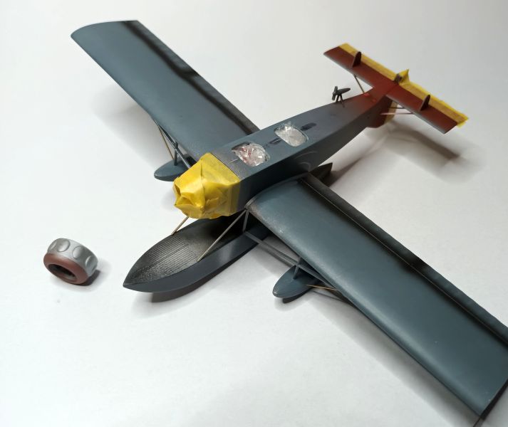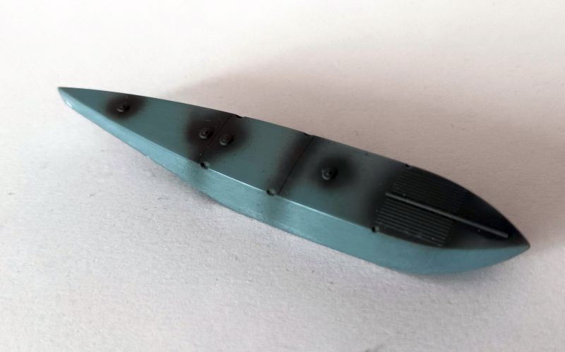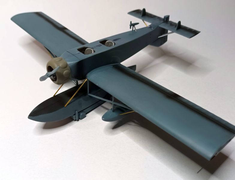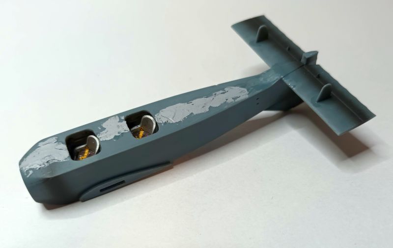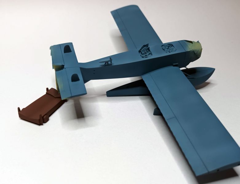 To najbardziej lubię, maluję farbami olejnymi Tamiya. Tradycyjnie najpierw zastosowałem presheding, później kolor właściwy (odcień zbliżony do oryginału), na koniec wszystko rozjaśniłem jaśniejszym odcieniem. Główny pływak otrzymał ślady eksploatacji, zacieki, obicia i temu podobne.