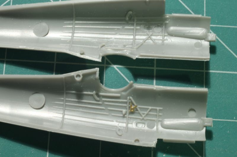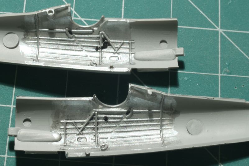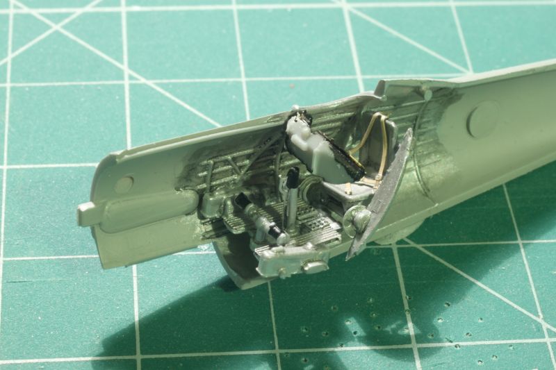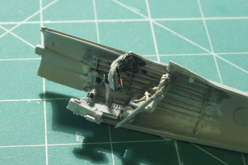Po nałożeniu szarego waschu całe wyposażenie umieściłem w prawej burcie kadłuba. Należy uważać na montaż tablicy przyrządów. W zestawie składa ona się z trzech części - tablicy plastikowej, kliszy i blaszki. Pomalowaną blaszkę i kliszę przykleiłem do elementu plastikowego i dopiero montowałem w kadłubie. Trochę trwało, zanim uzyskałem zadowalający mnie efekt. Następnym razem plastikową podstawę wkleję na sztywno przed malowaniem i dopiero na niej będę montować resztę detali.