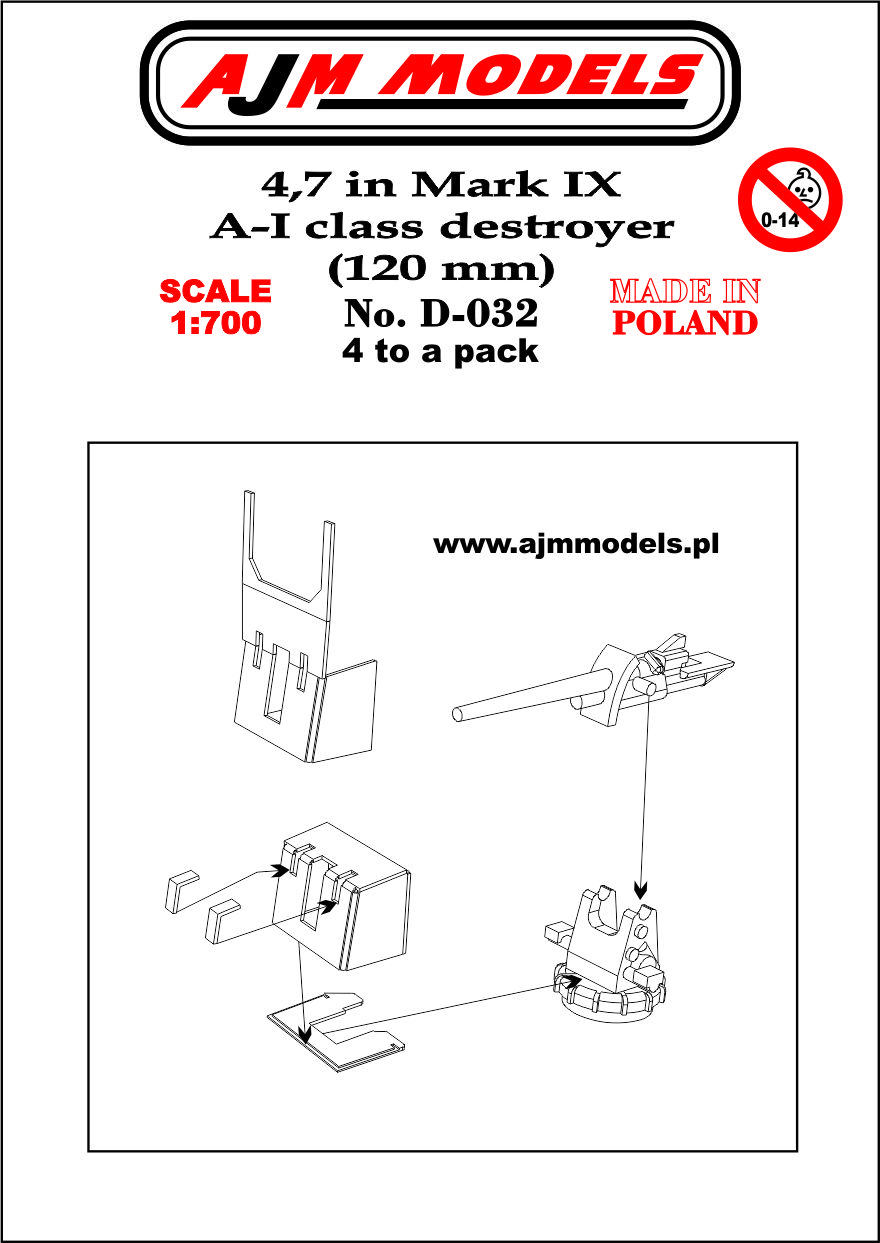AJM Models: 4,7" MK.IX A-I Class Destroyer (120 mm) Skala: 1:700 Nr kat: D-032 Opcje malowania: - Typ modelu: model żywiczny + elementy fototrawione. |