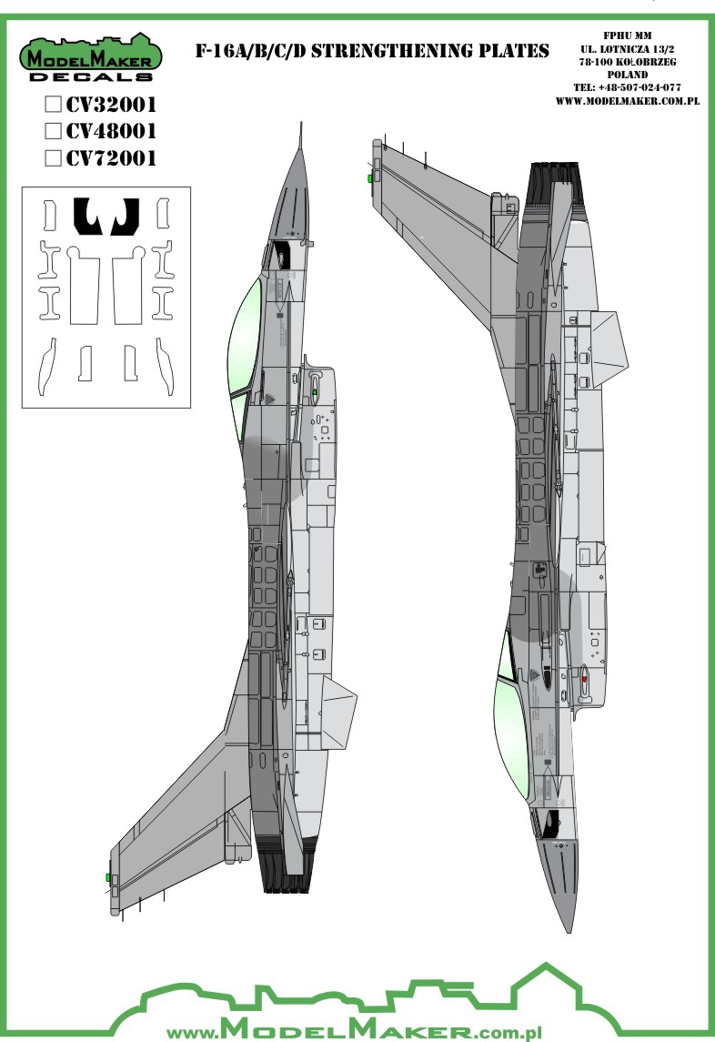 1/32: F-16 A/B/C/D strengthening plates - vinyl 1/48: F-16 A/B/C/D strengthening plates - vinyl 1/72: A/B/C/D strengthening plates - vinyl |