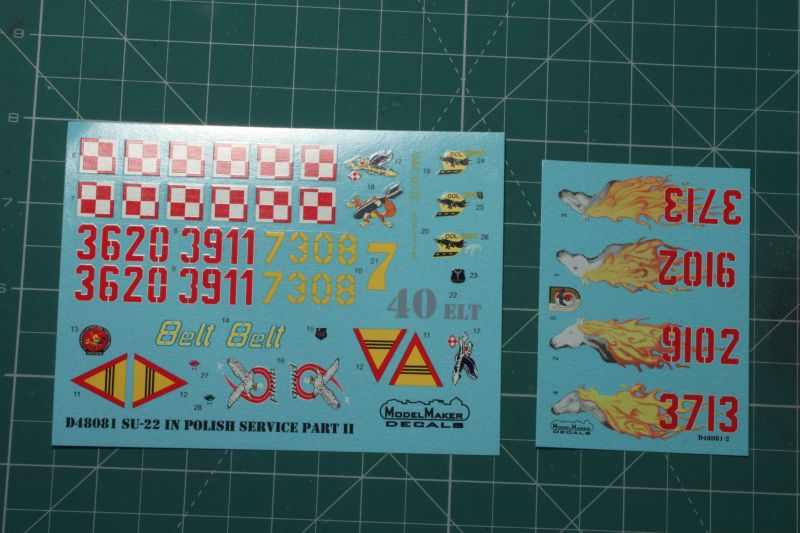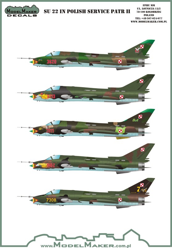 Oferta została uzupełnione o kolejne zestawy kalkomanii do współczesnych samolotów bojowych. Producent po raz kolejny zadbał o atrakcyjność swojej oferty, modelarze otrzymali zestawy umożliwiające wykonanie modeli w bardzo efektownych, często okolicznościowych malowaniach. W sprzedaży pojawił się również zestaw masek do wykonania wzmocnień strukturalnych do modeli samolotów F-16 A/B/C. Wszystkie nowe produkty opracowano w skalach 1/48 i 1/72, ponadto dwa z nich dostępne są w skali 1/32. Dla wielbicieli polskich malowań na współczesnych samolotach bojowych gratką będzie kolejny zestaw kalkomanii do modeli samolotów Su-22. W zestawie tym, oferowanym w skali 1/72 i 1/48 znajdują się w sumie pięć malowań, trzy ze Świdwina, jedno z Piły i jedno z Mirosławca. Nie są to co prawda najnowsze przykłady malowań według szarego schematu, ale to co zaproponował producent jest atrakcyjne, choćby z uwagi na „Ogniste kobyły” ze Świdwina czy oznaczenia udziału w ćwiczeniach na Drogowych Odcinkach Lotniskowych egzemplarza z Mirosławca. Atrakcyjności tym zestawom dodaje fakt, że większość z prezentowanych egzemplarzy stanowi eksponaty muzealne.