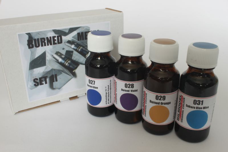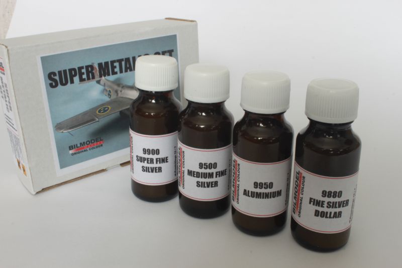 Oferta tego producenta poszerzyła się o nowe produkty. Są to tzw. supermetalizery, farby jeszcze lepiej oddające efekt metalicznego wykończenia malowanego elementu. Dostępne są cztery kolory: aluminium, fine silver, medium fine silver, oraz super fine dollar. Drugim zestawem są specjalne metalizery imitujące wypalony metal występujący na dyszach odrzutowców. Zestaw ten, Burned Metal set składa się z czterech kolorów: burned blue, burned orange, burned violet i subaru blue mica. Oba zestawy farb przeznaczone są do malowania aerografem. Producent oferuje do nich specjalny rozpuszczalnik, ale z powodzeniem można stosować do nich podobne produkty firmy Gunze Sangio. Od niedawna farby Bilmodelmakers otrzymały nowe opakowania w postaci niewielkich szklanych butelek (prezentujemy je na zdjęciach), podobnie pakowane są inne produkty tej firmy. Są to podkład, surfacer 1200 oraz nowa odmiana kleju „Spawacz” z żółtą etykietą – mocniej reagująca z polistyrenem, przypominająca nieco Extra Thin Cement firmy Tamiya.