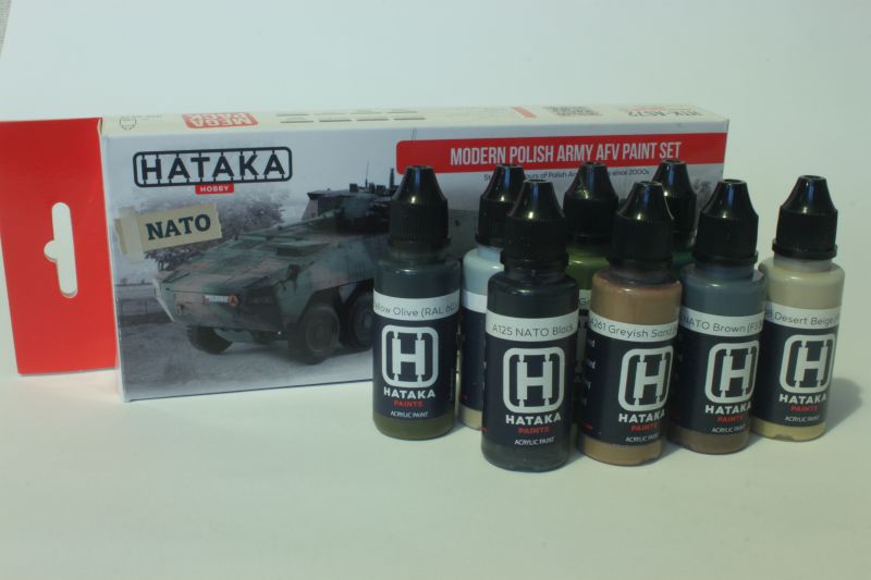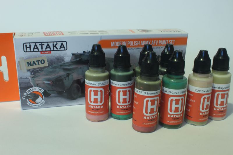 Poza dalszym rozszerzeniem oferty farb akrylowych o nowe zestawy tematyczne, Hataka wprowadziła kolejną nową linię produktów „Orange line”. Są to farby rozpuszczalnikowe przeznaczone do malowania aerografem. Przypominają nieco produkty japońskie. Wszystkie rodzaje farb zostały przetestowane przez modelarzy z KPM-u i uzyskały bardzo pochlebne opinie. Nie są to jednak czcze słowa, gdyż wszystkie linie produktów HATAKA zostały z powodzeniem przetestowane podczas prac przy budowanych przez nas modeli. Testowaliśmy zarówno farby akrylowe oraz lakiery z zestawów na zdjęciach poniżej, jak i inne farby. Wszystkie testy zakończyły się powodzeniem.