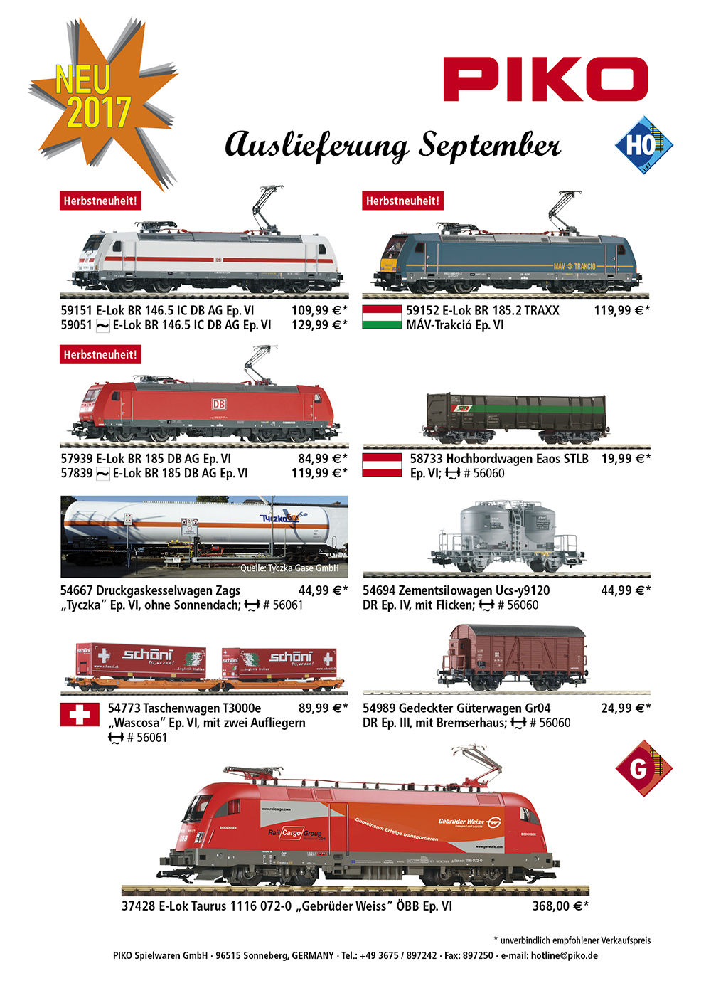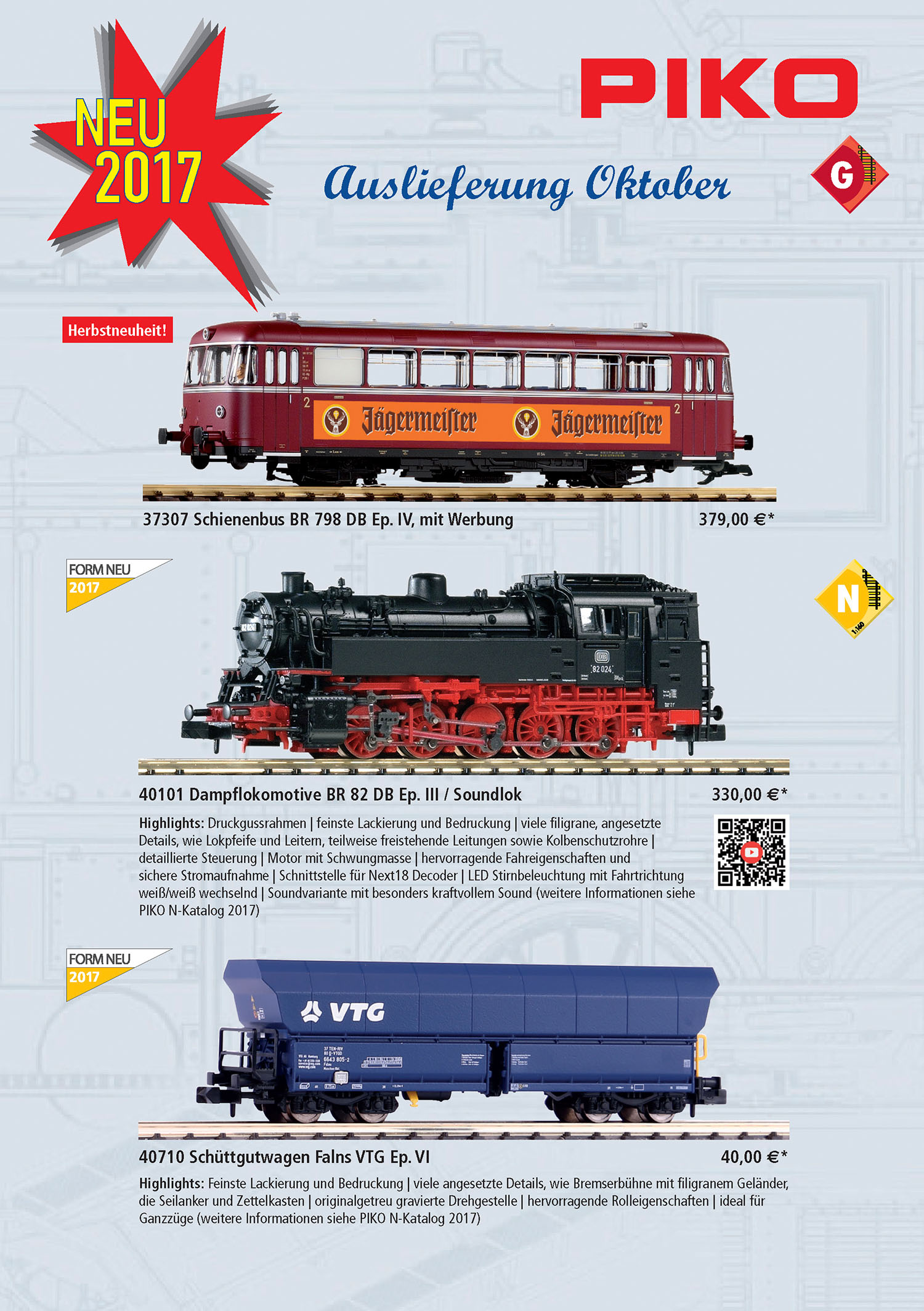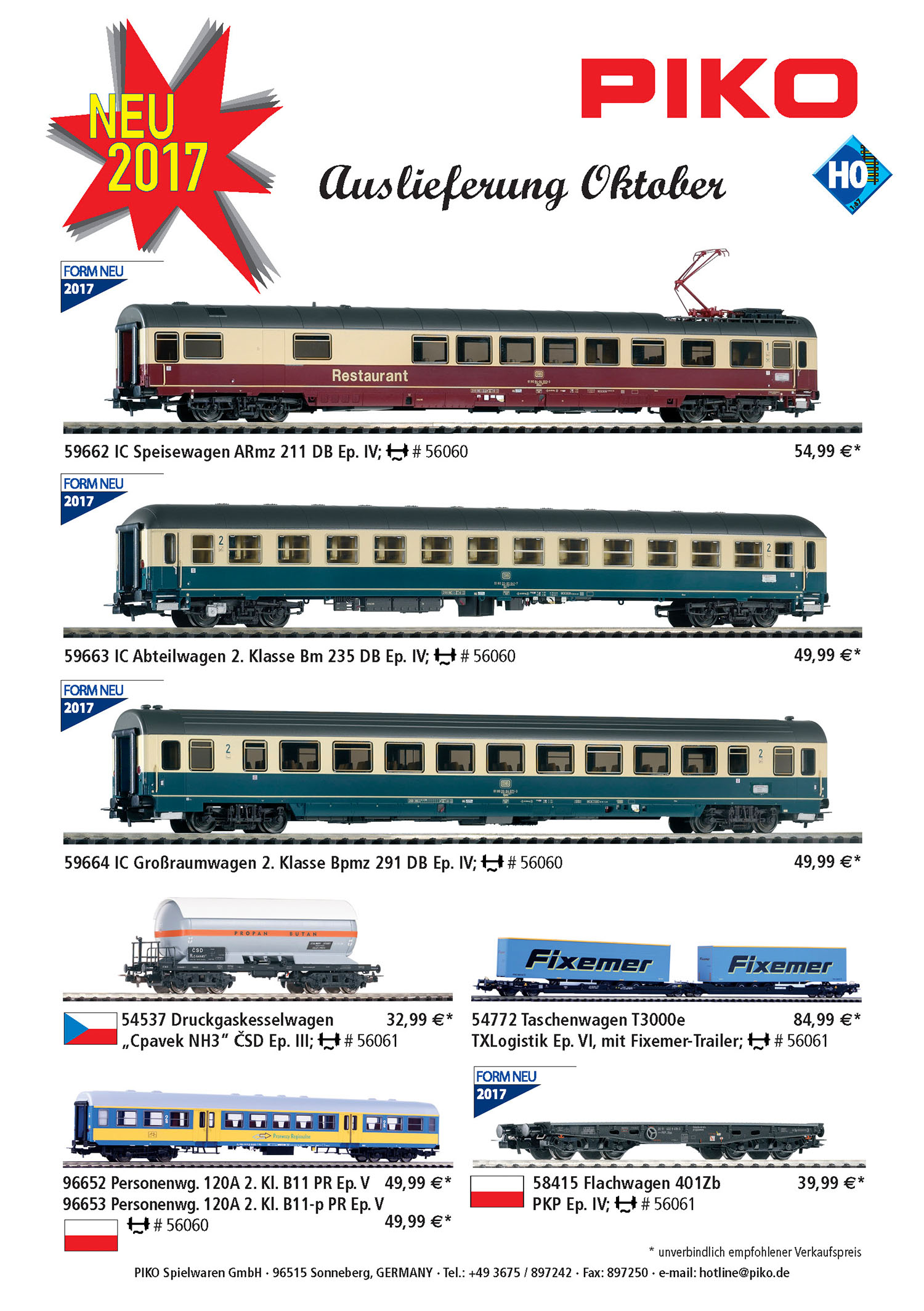 Także Piko przygotowało jesienią sporo nowości. O ile wrzesień był dość spokojny, o tyle w październiku pojawiło się sporo ciekawych propozycji jeśli chodzi o europejski tabor kolejowy, a wśród nich dwie nowości które zainteresują fanów polskich kolei. Są to wagon pasażerski 120A, czyli popularna „Bonaza” w malowaniu z V Epoki, oraz czteroosiowa lora 401 zb z VI Epoki. Ponadto firma rozszerza swoją ofertę w skalach G oraz N.
