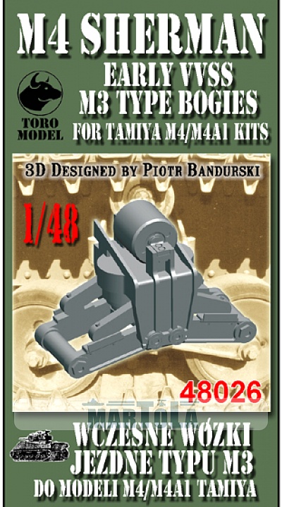 Toro Models: M4 Sherman early vvss M3 type bogies Skala: 1:48 Nr kat: 48026 Dedykowany do: Tamiya Typ modelu: konwersja żywiczna. |