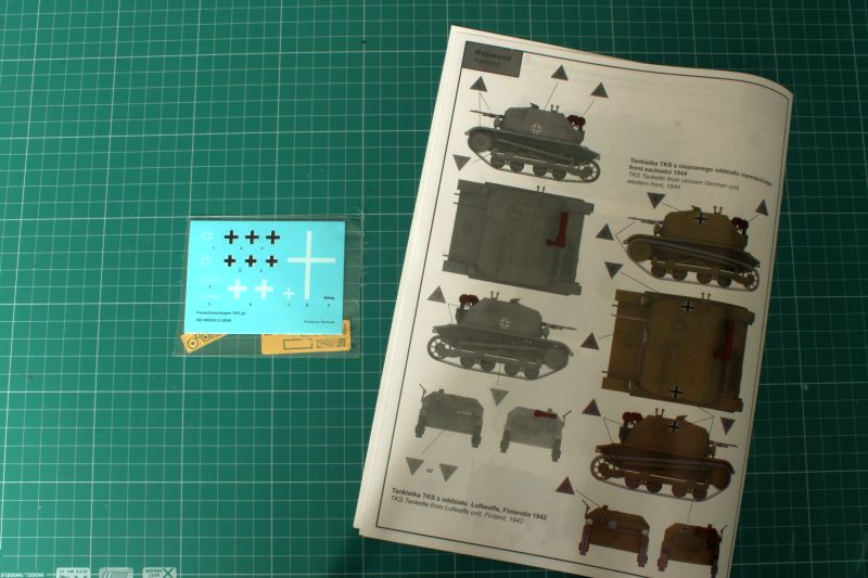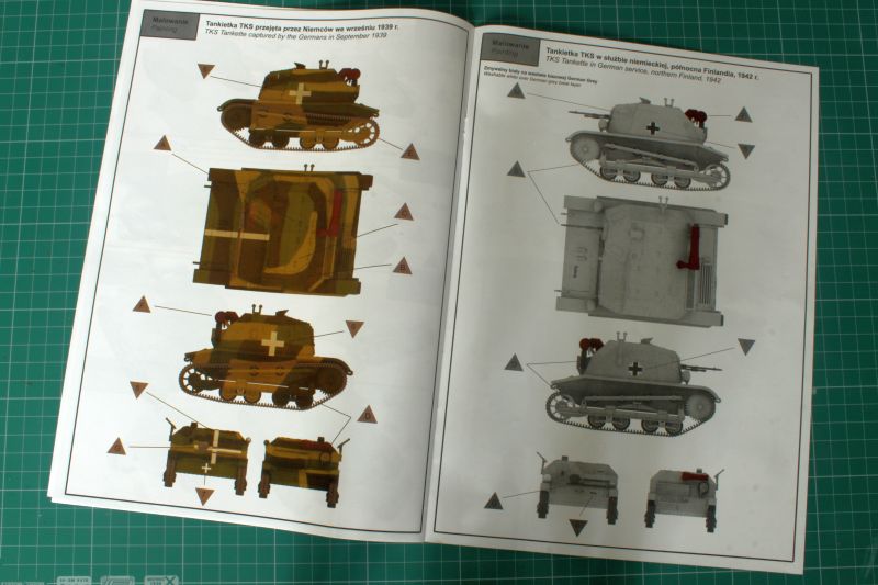 Trzecia odsłona TKSa to pojazd określany jako Panzerkampfwagen TKS (p) Jak łatwo się domyśleć mamy tu do czynienia z zestawm, który umożliwia wykonanie modelu pojazdu zdobycznego. Po Kampanii wrześniowej, Niemcy przejęli pewna ilość tych pojazdów i wykorzystwali praktycznie do końca wojny. Model ztem możemy wykonać w jednym z czterech malowań - polską maszynę z oznaczeniami Wehrmachtu, dwie używane w Finlandii oraz jedną używaną przez nieokreśloną niemiecką jednostkę na forcie zachodnim w 1944r. Jaka szkoda, że nie ma bliższych danych na temat tej ostatniej. TKS w Noramdii oglądany przez spadochroniarzy z 82 AB, to by była dioramka! Jesli natoamst chodzi o sam zestaw, to jest on identyczny z 35045, nie ma tylko figurek. w tym wypadku producent zrezygonował także z wersji z frabkami oraz zestawu startowego dla poczatkujących.