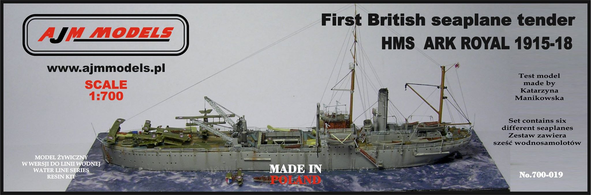 AJM MODELS: First British seaplane tender HMS Ark Royal 1915-18 skala: 1:700 Nr kat: 350-019 Opcje malowania: 1 Typ modelu: model żywiczny, elementy fototrawione, elementy metalowe |