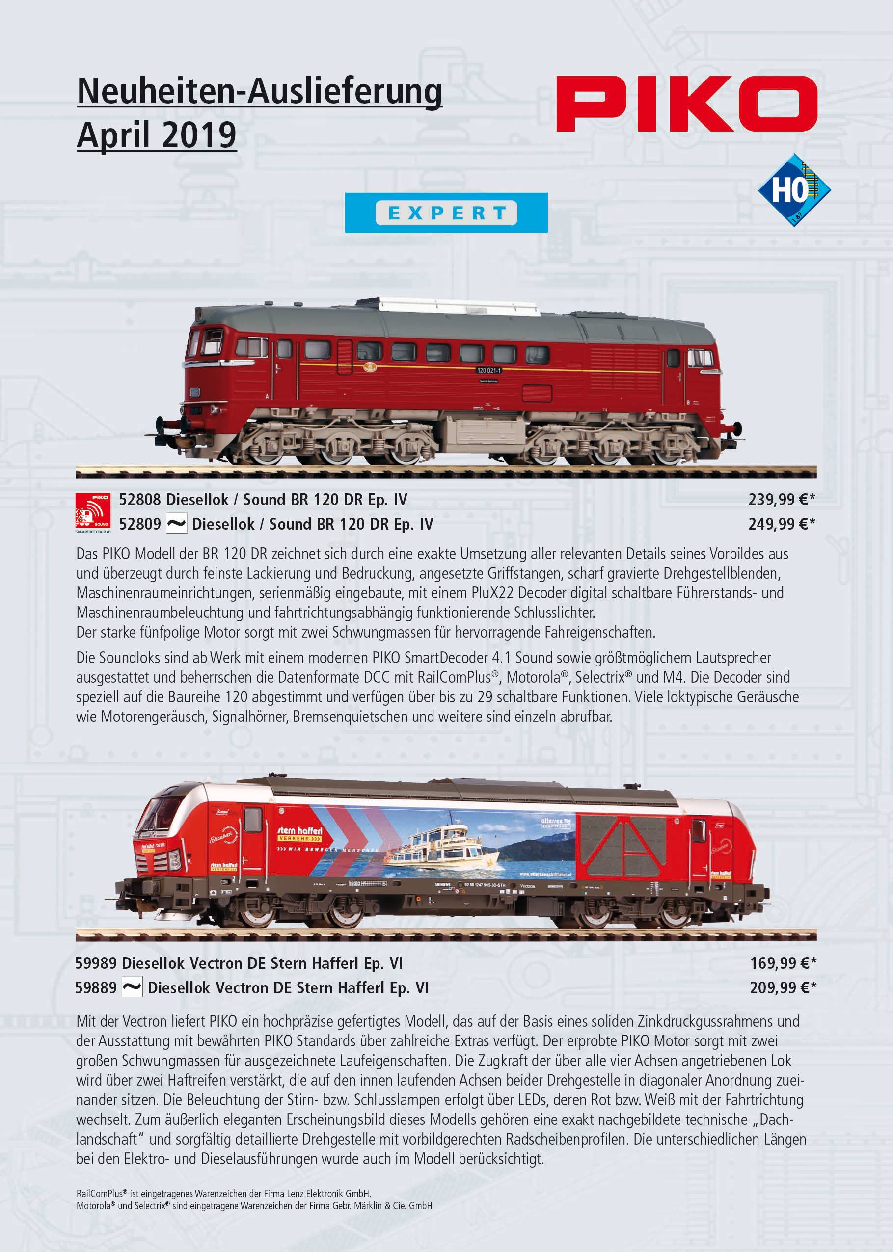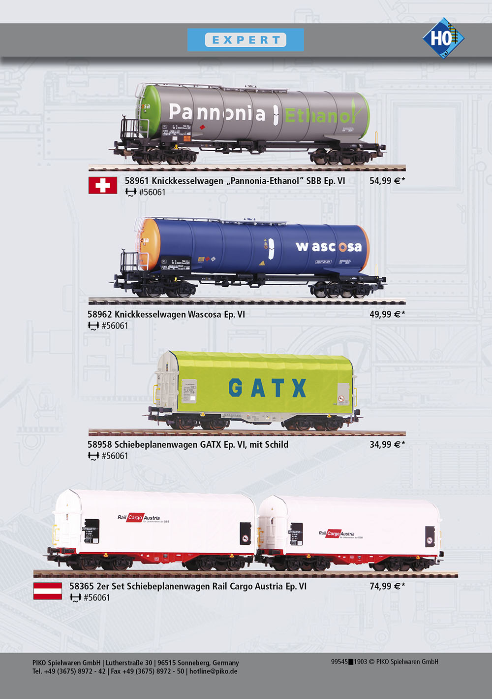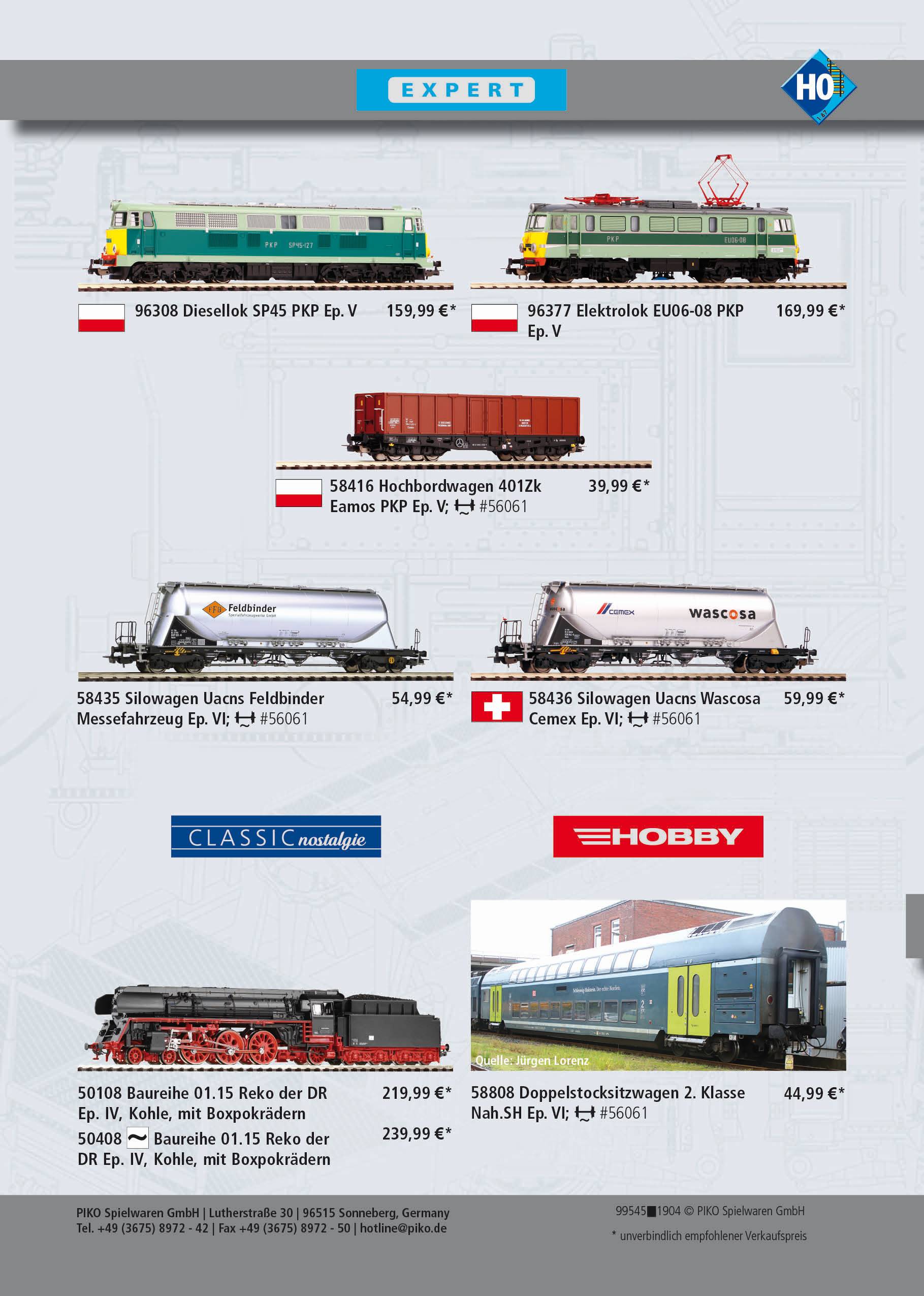 Sporo nowości przegotowała także firma PIKO, w sumie kilkanaście pozycji we wszystkich trzech skalach. W segmencie "Expret" pojawiły się dwa swego czasu zapowiadane i oczekiwane modele polskich lokomotyw SP-45 i Eu-06, które uzupełnia wagon czteroosiowego wagonu węglarki. Jest także sporo ciekawych propozycji taboru kolejowego innych przewoźników europejskich.