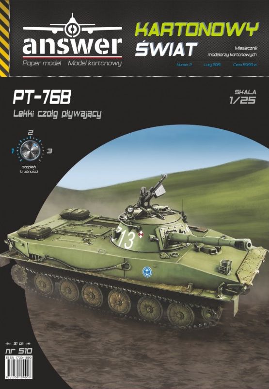 Answer Kartonowy Świat: PT-76B Skala: 1:25 Nr kat: No. 510 Typ modelu: model kartonowy |