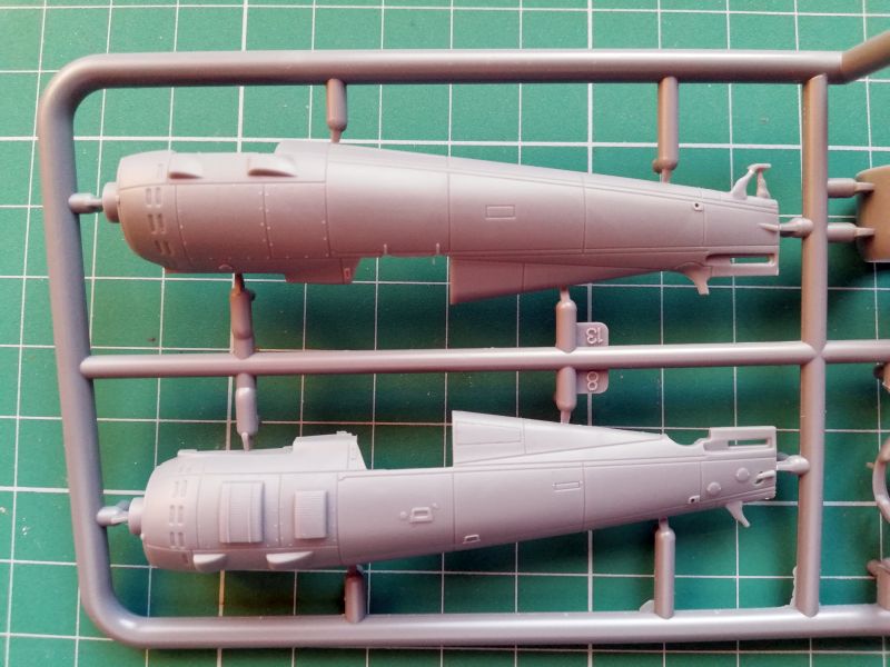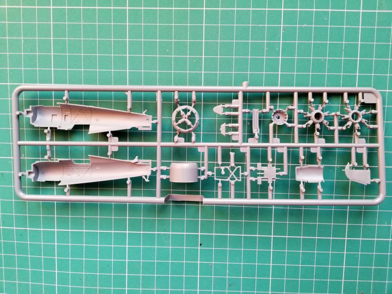 Chłodnice zostały zaprojektowane jako integralne detale lewej połówki kadłuba i trzeba przyznać, że wyszło to całkiem poprawnie, żadnych jamek skurczowych, zapadlisk, a faktura bardzo ładnie oddana. Ponieważ odmiana G miała krótki wlot powietrza do gaźnika, będziemy musieli odpowiednio zmodyfikować element nr 4. Należy nie tylko odciąć zbędną część, ale także odchudzić nieco ścianki, bez tego zabiegu będą "pancerne" co będzie psuło efekt naszej pracy. Pozostałe elemenety wtryskowe oraz oszklenie są takie same jak w przypadku Kobuza, więc pokazywanie ich w tym miejscu nie ma sensu, zachęcamy do zapoznania się z recenzją tego modelu, a także relacją z budowy.