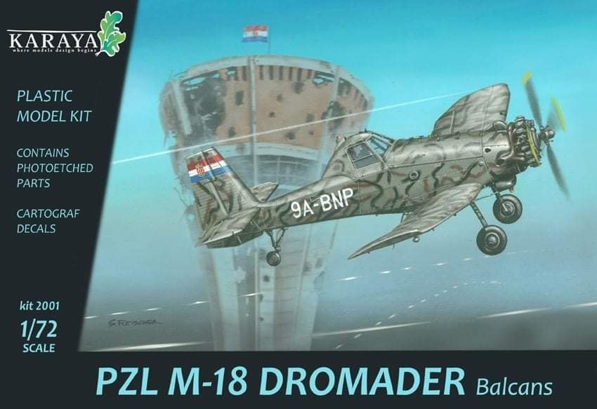 Na początek zapowiedź firmy Karaya, która także postanowiła rozpocząć produkcję modeli wtryskowych. Producent jako pierwszy swój model w tej technologii zapowiedział model samolotu gaśniczo - rolniczego PZL M-18 Dromader. Plotki na ten temat krążyły od jakiegoś czasu, ale teraz informacja przybrała oficjalna postać. Pierwszy zestaw umożliwiający budowę modelu tego samolotu, jako improwizowanej wersji szturmowej używanej podczas wojen na Bałkanach ma trafic na rynek już w lutym przyszłego roku. Z informacji na pudełku wynika, iż będzie zawierał elementy fototrawione i kalkomanie firmy Cartograf. Trzymamy kciuki za powodzenie projektu.