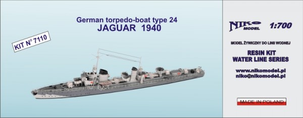 NIKO MODELS: Torpedo-boat type 24 JAGUAR 1940 skala: 1:700 Nr kat: 7110 Opcje malowania: 1 Typ modelu: model żywiczny, elementy fototrawione |