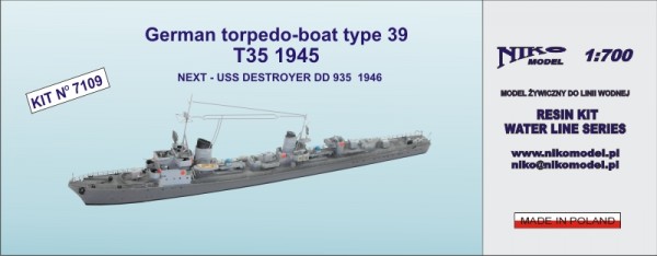 NIKO MODELS: Torpedo-boat type 39 T35 1945 skala: 1:700 Nr kat: 7109 Opcje malowania: 1 Typ modelu: model żywiczny, elementy fototrawione |