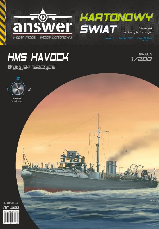 Answer Kartonowy Świat: Brytyjski niszczyciel HMS Havock Skala: 1:200 Nr kat: No. 520 Typ modelu: model kartonowy |