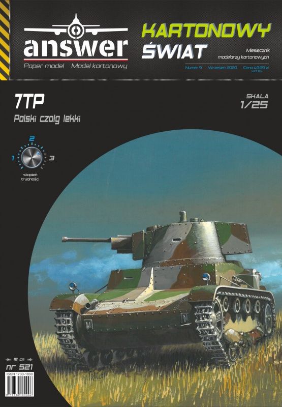 Answer Kartonowy Świat: Polski czołg lekki 7TP Skala: 1:25 Nr kat: No. 521 Typ modelu: model kartonowy |