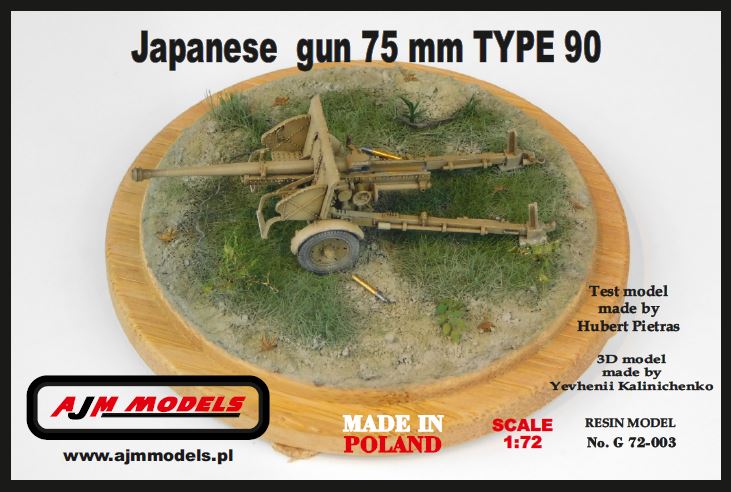 AJM Model: Japanese gun 75 mm type 90 Skala: 1/72 Nr kat: G. 72-003 Opcje malowania: 1 Typ modelu: model żywiczny, elementy fototrawione, drut |