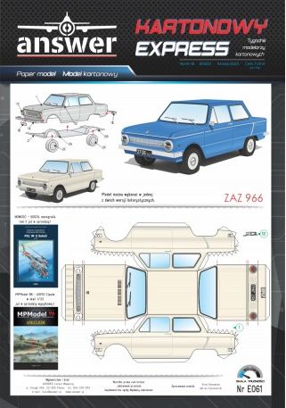 Kartonowy Ekspres: ZAZ 966 Skala: - Nr kat: No. E061 Typ modelu: model kartonowy |