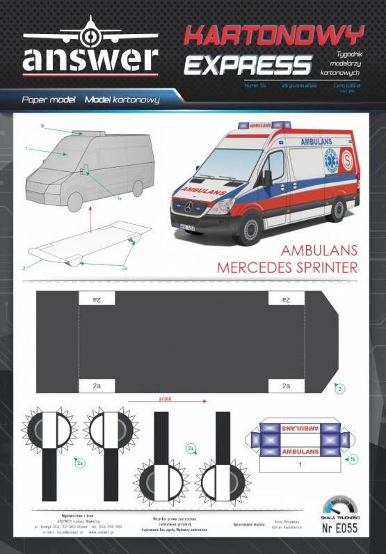 Kartonowy Ekspres: Ambulans Mercedes Sprinter Skala: - Nr kat: No. E055 Typ modelu: model kartonowy |