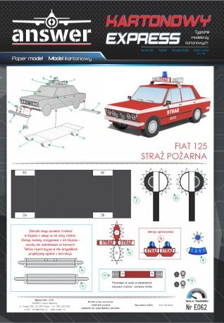 Kartonowy Ekspres: FIAT 125 Straż Pożarna Skala: - Nr kat: No. E062 Typ modelu: model kartonowy |