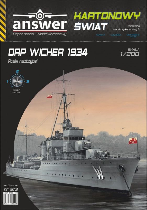 ANSWER Kartonowy Świat: ORP Wicher 1934 Skala: 1:200 Nr kat: No. 573 Typ modelu: model kartonowy |