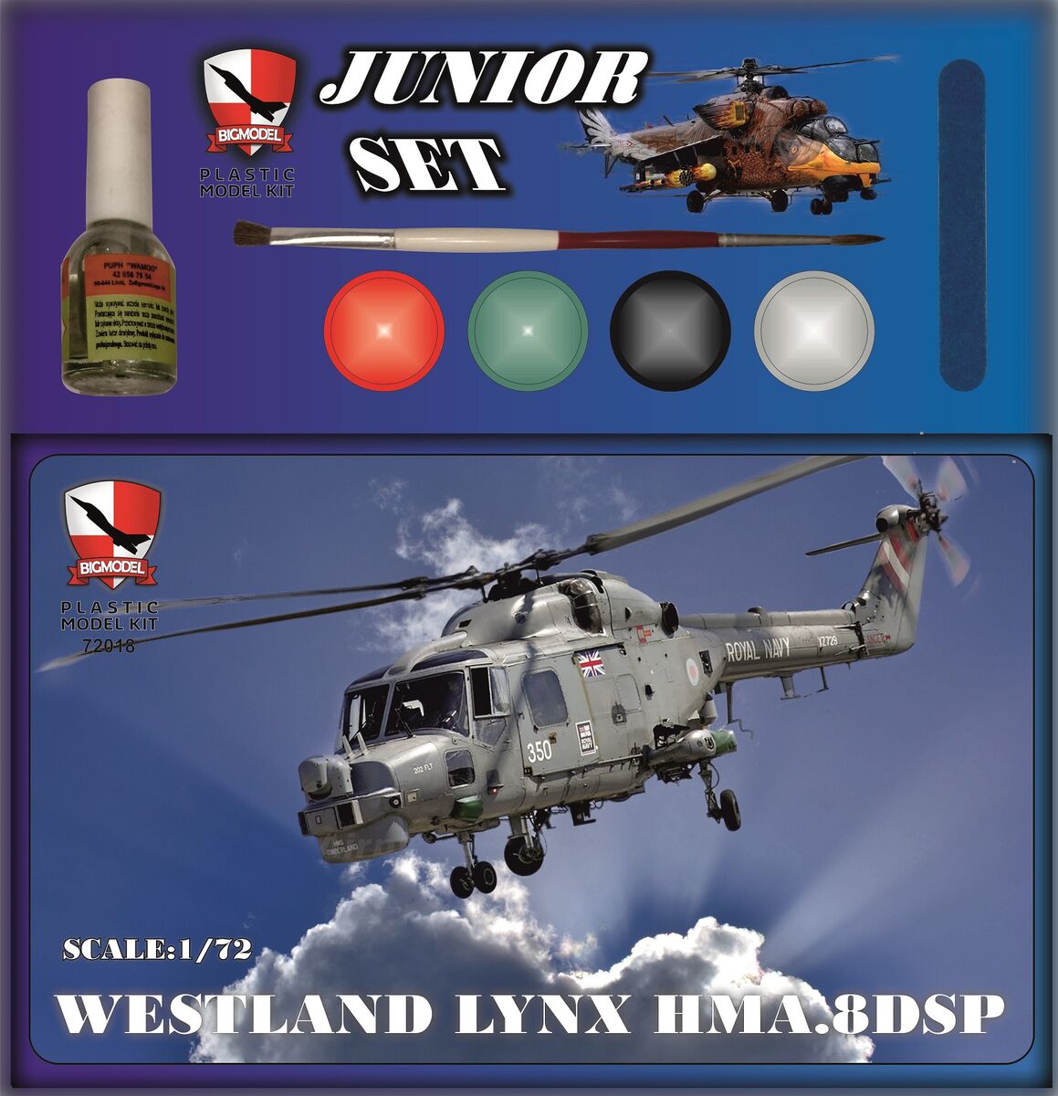 Big Model: Westalad Lynx HMA.8DSP Junior SET Skala: 1:72 Nr kat: BGMJS72018 Opcje malowania: 1 Typ modelu: model wtryskowy (ex ZTS Plastyk), farby, klej, narzędzia |