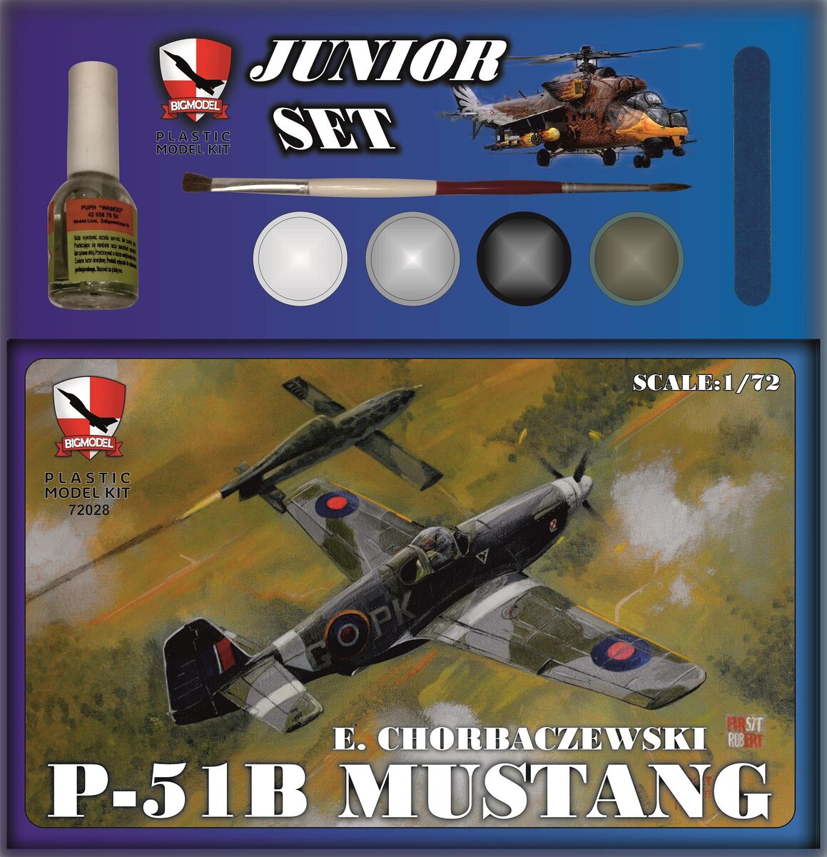 Big Model: P-51B Mustang Mk. III E. Chorbaczewski Junior SET Skala: 1:72 Nr kat: BGMJS72028 Opcje malowania: 1 Typ modelu: model wtryskowy (ex ?), farby, klej, narzędzia |