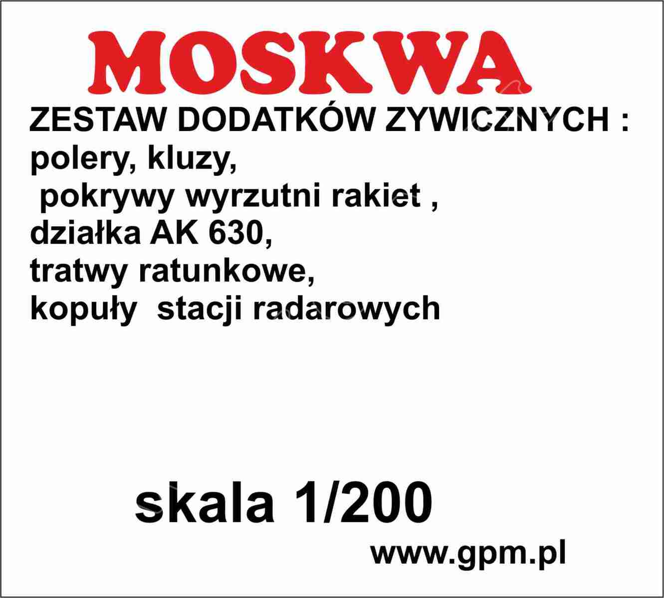 GPM: Krążownik rakietowy Moskwa Detail Set Skala: 1:200 Nr kat: 3D-200-608 Typ modelu: druk 3D |