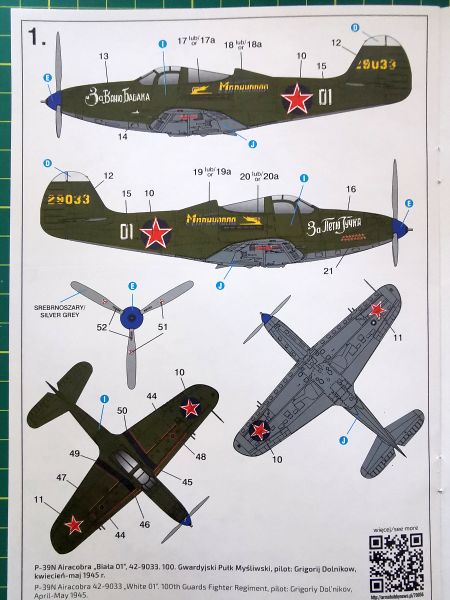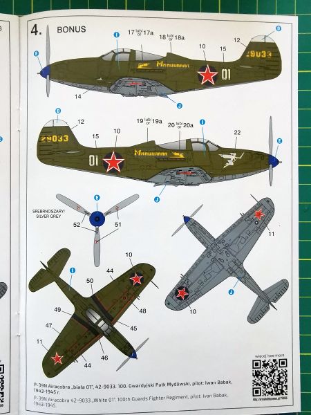 • P-39N Airacobra „Biała 01”, 42-9033. 100. Gwardyjski Pułk Myśliwski, piloci: Iwan Babak i Grigorij Dolnikow, 1943-1945 r. (Malowanie Iwana Babaka to właśnie ten bonus - jest to malowanie z wcześniejszego okresu, malowanie zasadnicze przedstawia ten sam samolot, ale z okresu , kiedy latał na nim przyjaciel I. Babaka, G. Dolnikow po tym jak Babak dostał się do niewoli. Dolnikow był przekonany , że jego przyjaciel nie żyje, stąd na nosie Cobry okolicznościowe inskrypcje).