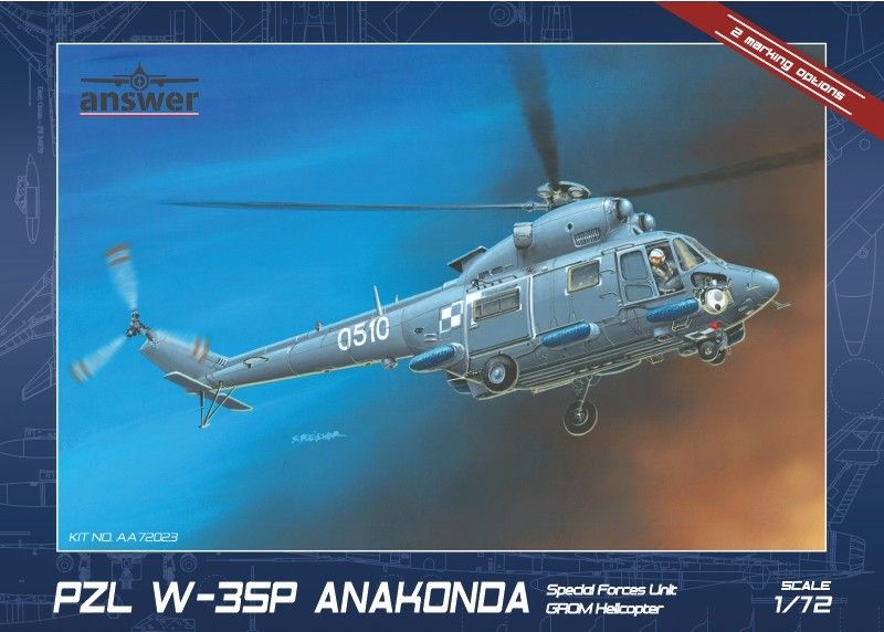 Answer Plastic Kits: PZL W-3 SP Anakonda Special Forces Unit GROM Helicopter Skala: 1:72 Nr kat: AA 72023 Opcje malowania: 3 Typ modelu: model wtryskowy, el. fototrawione |