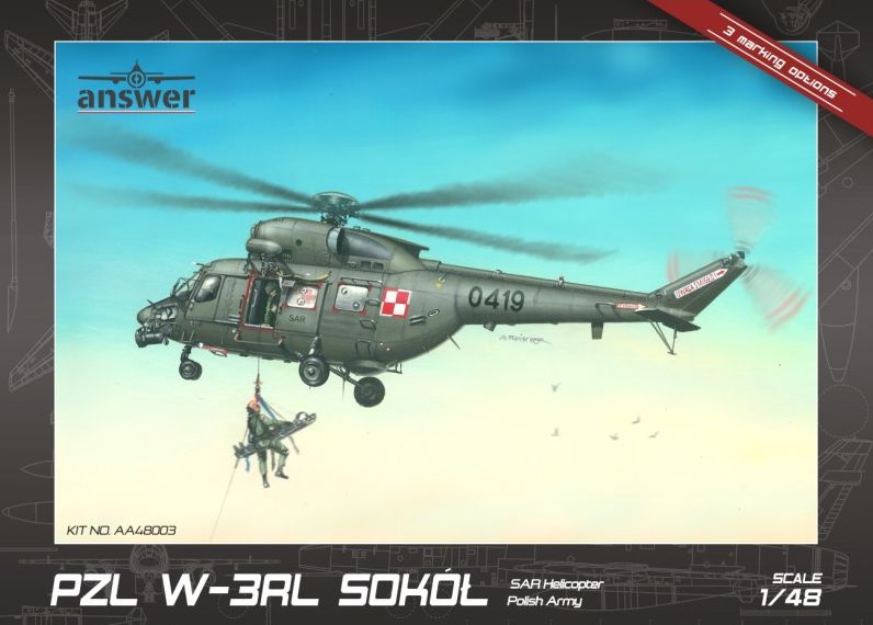 Answer Plastic Kits: PZL W-3 RL Sokół SAR Helicopter Polish Army Skala: 1:48 Nr kat: AA48003 Opcje malowania: 3 Typ modelu: model wtryskowy, el. fototrawione |