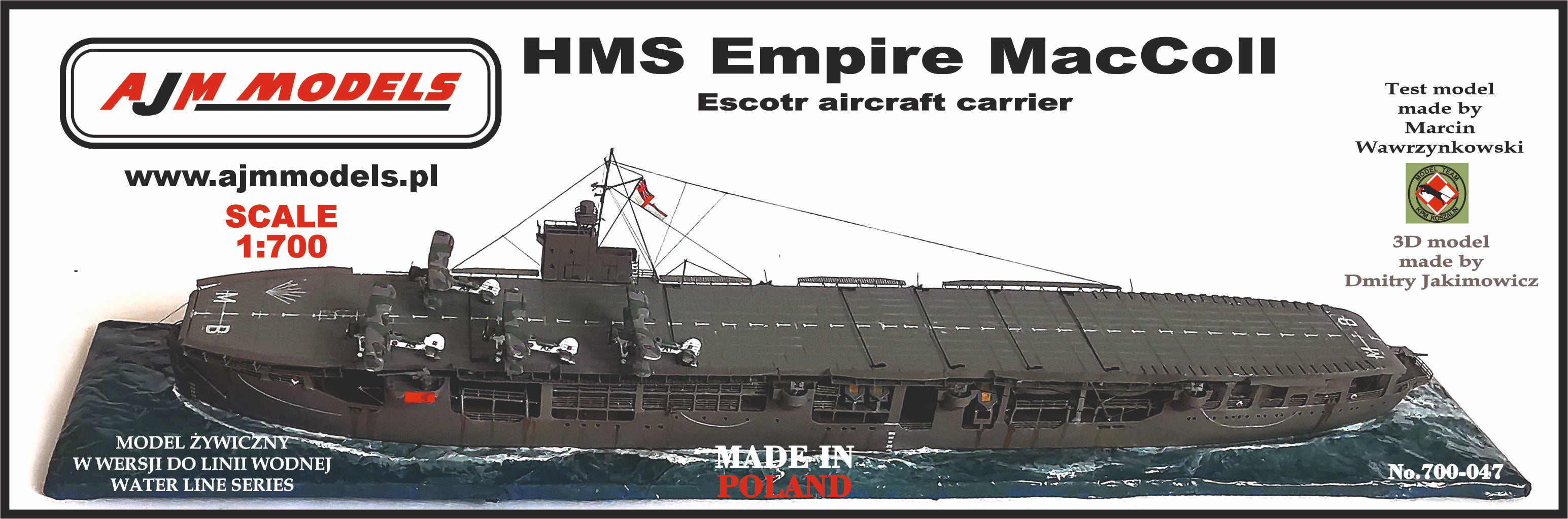 AJM Model: HMS Empire MacColl, Escort aircratf cuiser Skala: 1/700 Nr kat: 700-047 Opcje malowania: 1 Typ modelu: model żywiczny, elementy fototrawione, drut |