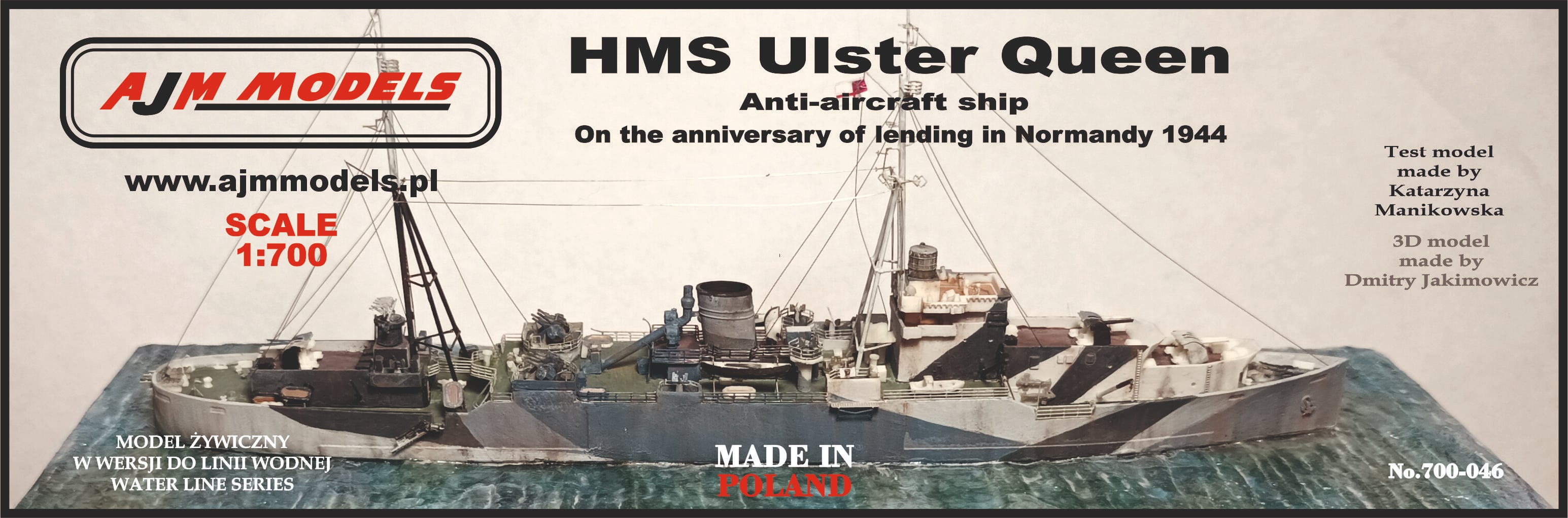 AJM Model: HMS Ulster Queen, 6 june 1944, anti aircratf cuiser Skala: 1/700 Nr kat: 700-046 Opcje malowania: 1 Typ modelu: model żywiczny, elementy fototrawione, drut |