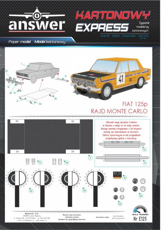 Kartonowy Exspress: Fiat 125p Rajd Monte Carlo Skala: - Nr kat: No. E125 Typ modelu: model kartonowy |