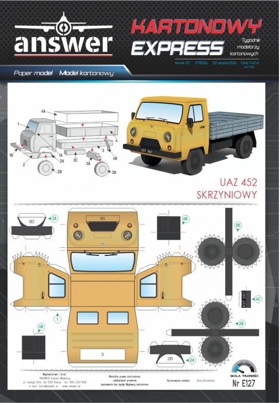 Kartonowy Exspress: UAZ 452 Skrzyniowy Skala: - Nr kat: No. E127 Typ modelu: model kartonowy |