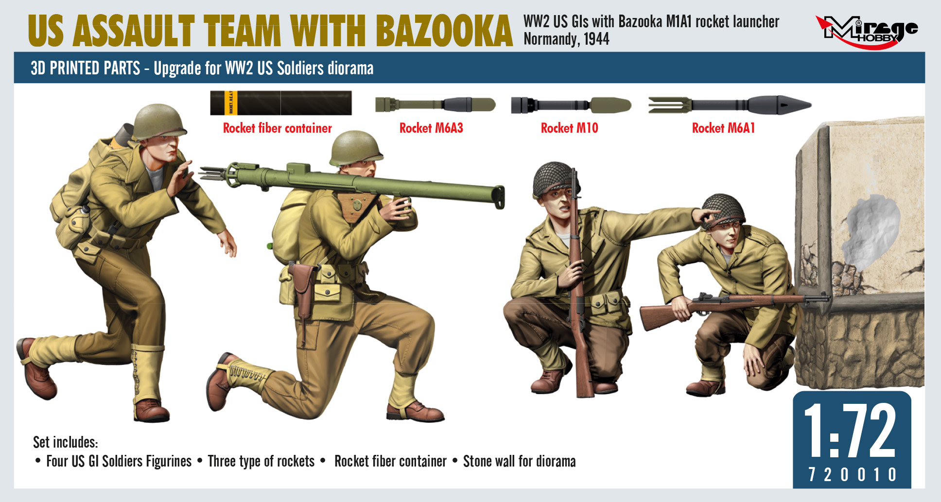 Mirage Hobby: US Assault Team with Bazooka Skala: 1:72 Nr kat: 720010 Opcje malowania: 1 Typ modelu: wydruk 3D |