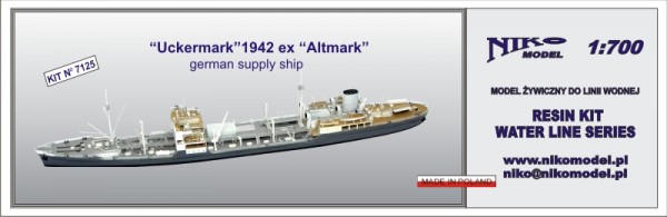 NIKO Model: "Unckermark" 1942 ex "Altmark" german supply ship Skala: 1/700 Nr kat: 7125 Opcje malowania: 1 Typ modelu: model żywiczny, elementy fototrawione, drut |