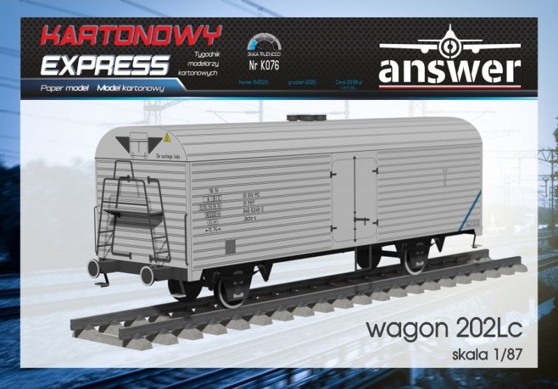 Kartonowy Exspress: Wagon 202Lc Skala: 1:87 Nr kat: No. K076 Typ modelu: model kartonowy |