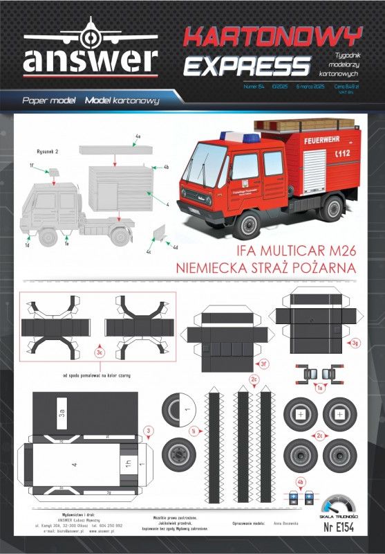 Kartonowy Exspress: IFA Mulsticar M26 Niemiecka Straż pożarna Skala: - Nr kat: No. E154 Typ modelu: model kartonowy |