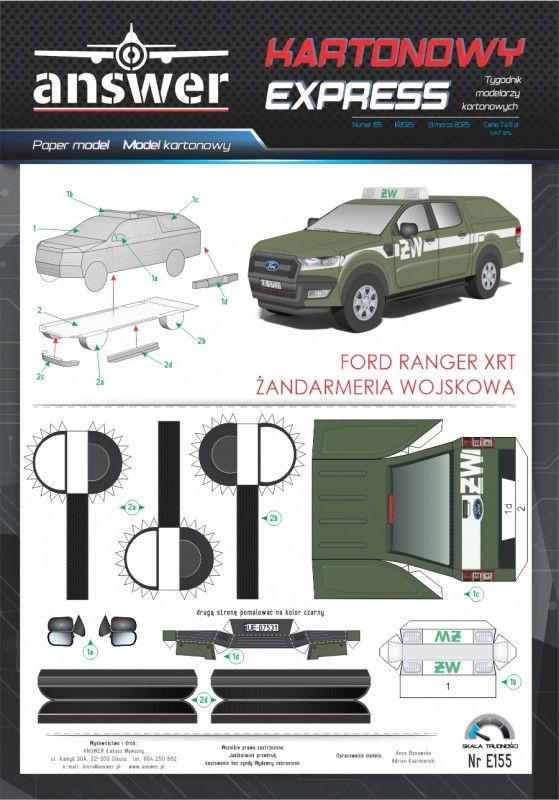 Kartonowy Exspress: FORD RANGER XRT Żandarmeria Wojskowa Skala: - Nr kat: No. E155 Typ modelu: model kartonowy |