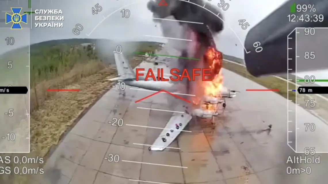 Płonący bombowiec Tu-95 po ataku ukraińskich dronów. Zdjęcie: Służba Bezpieczeństwa Ukrainy |