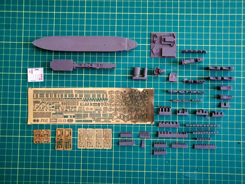 Tyle historia, oczywiście w telegraficznym skrócie, a teraz najważniejsze, czyli model. Jak to w przypadku AJM Models, zestaw to żywiczna 700-tka w konwencji do linii wodnej. Jak widać na powyższym zdjęciu, spora ilość elementów żywicznych, bardzo ładnie zresztą odlanych uzupełniona kilkoma blachami fot otrawionymi oraz kalkomanią. Docelowo będzie także drut o różnych grubościach do wykonania masztów, bomów i temu podobnych rzeczy. Oczywiście, to co pokazałem na zdjęciu może się nieco różnić, od modeli, które trafią do produkcji, ale z grubsza tak to będzie wyglądać.