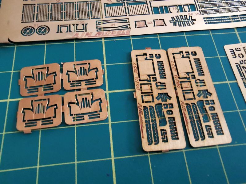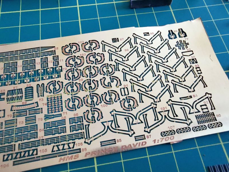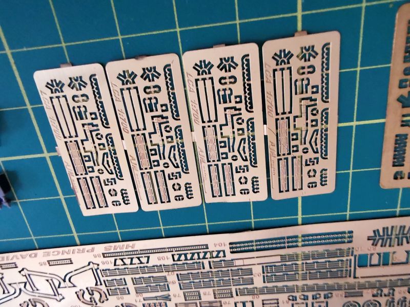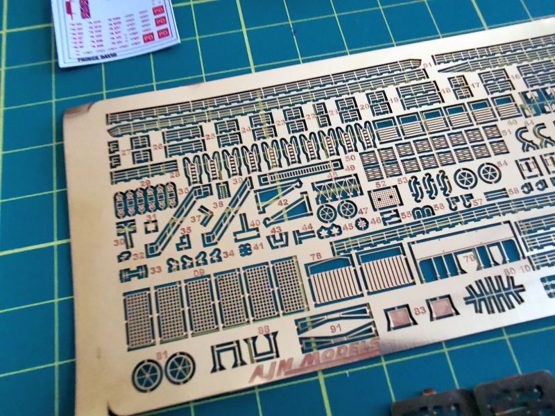 Większość mikromodeli okrętów w podziałce 1/700 ma „na wyposażeniu” fot otrawioną blaszkę, albo częściej blaszki. W przypadku modeli żywicznych to jest norma i nowe modele AJM Models nie są tu wyjątkiem. Podstawę stanowi pokaźnych rozmiarów blacha na której rozmieszczono większość detali przeznaczonych do zamontowania w modelu, czyli wszelkiego rodzaju relingi, schodnie, żurawiki, siatki oraz wszystko co jednych doprowadzi na skraj euforii a innych rozpaczy. Poza tym osobne blaszki to osłony dział 102 mm, dlatego, że producent wykorzystuje je do większości swoich modeli, a także do barek desantowych, które są zarówno składnikami zestawów do budowy modeli okrętów desantowych takich jak omawiany w tym miejscu, czy też wydane poprzednio HMS „Princess Beatrix” czy HMS „Royal Ulsermann” ale też jako osobne zestawy.