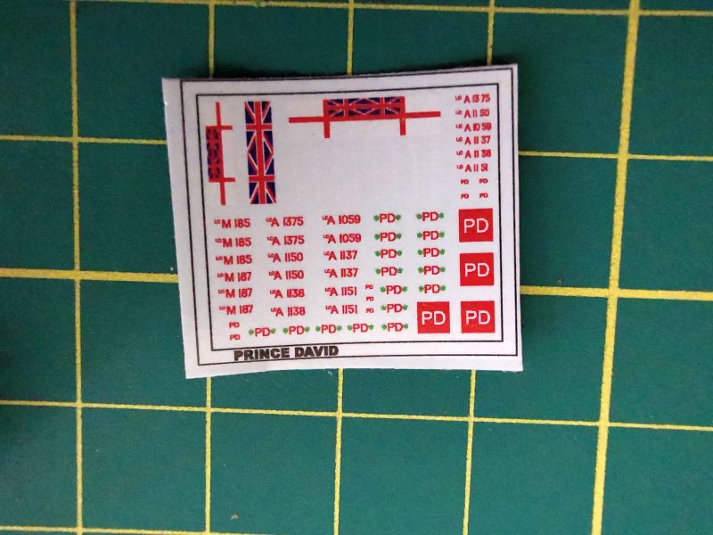 Poza nadbudówkami, otrzymujemy także sporo wlewek z drobnymi i bardzo drobnymi elementami z wyposażeniem pokładowym, ratunkowym i uzbrojeniem okrętu. Przedstawiłem na zdjęciu z lewej kilka z nich. Jest tego sporo, ale w umiarkowanym stopniu. Za to dość bogato wygląda arkusik kalkomanii, ponieważ poza banderami, podziałkami zanurzenia czy też nazwą okrętu, otrzymujemy oznaczenia na barki desantowe, co na pewno sprawi, że nasza miniaturka będzie wyglądać bardzo efektownie.