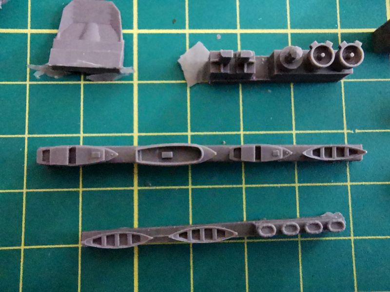 Z tym za to zetkniemy się w przypadku nadbudówek. Wszystkie trzeba poodcinać z kostek wlewowych, lub też zeszlifować z płytki, na której znajduje się kilka elementów. Taki jest jednak urok modeli żywicznych, nikt nie mówił że będzie łatwo. Faktura i oddanie detali poszczególnych elementów jest wykonane bardzo ładnie i stawia firmę AJM Models w gronie liderów producentów mikromodeli żywicznych. Choćby wsporniki pod pokładami, czy podstawy działek przeciwlotniczych i reflektorów wykonane jako detale pomostów. To bardzo zaoszczędzi pracy, której przy tego typu modelach przecież nie brakuje.