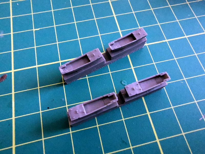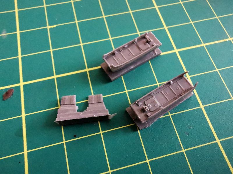 Na wyposażeniu HMCS „Prince David” znajdowało się w sumie dziesięć barek desantowych. Sześć mniejszych LCA oraz dwie większe LCM. Każda z tych barek to właściwie osobny model, składający się z detali żywicznych widocznych na powyższych zdjęciach oraz fot otrawionej blaszki, o których wspominałem poprzednio. Zabawy będzie z nimi niemało, ale uzyskany efekt powinien to zrekompensować. Tym bardziej, że barki desantowe także nosiły malowanie kamuflażowe.