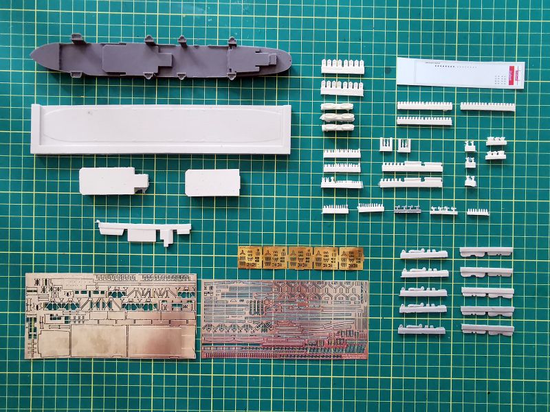 Sam zestaw, to klasyczny AJM Models, produkt do którego mikromodel arze okrętowi zdążyli się przyzwyczaić. Model opracowano w konwencji „do linii wodnej”, podstawowe elementy to odlewy żywiczne, które zostały uzupełnione o sporej wielkości fototrawione blaszki. Jest także i kalkomania, w seryjnych modelach znajdą się pewnie i kawałki drutu w różnych grubościach. Ponieważ miałem wersję testową drut musiałem zorganizować we własnym zakresie.